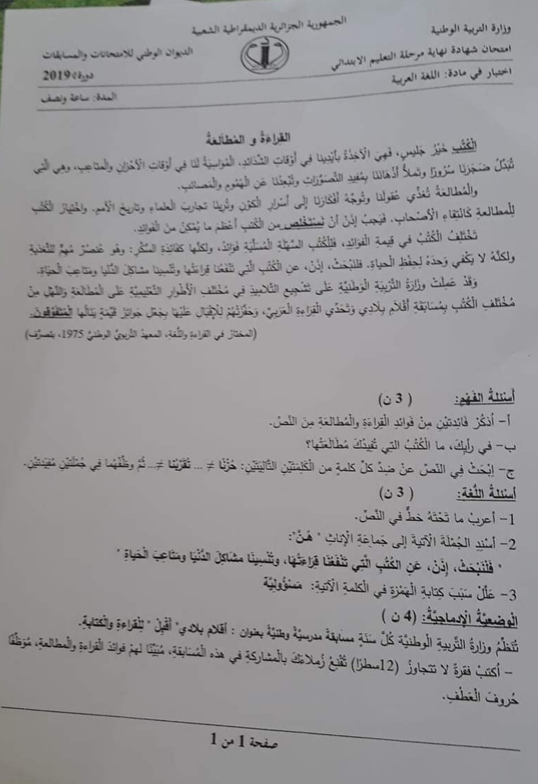 تصحيح موضوع اللغة العربية شهادة التعليم الابتدائي 2019 موقع الدراسة الجزائري