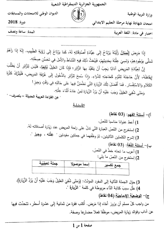 تصحيح موضوع اللغة العربية 2018 لشهادة التعليم الابتدائي موقع الدراسة الجزائري