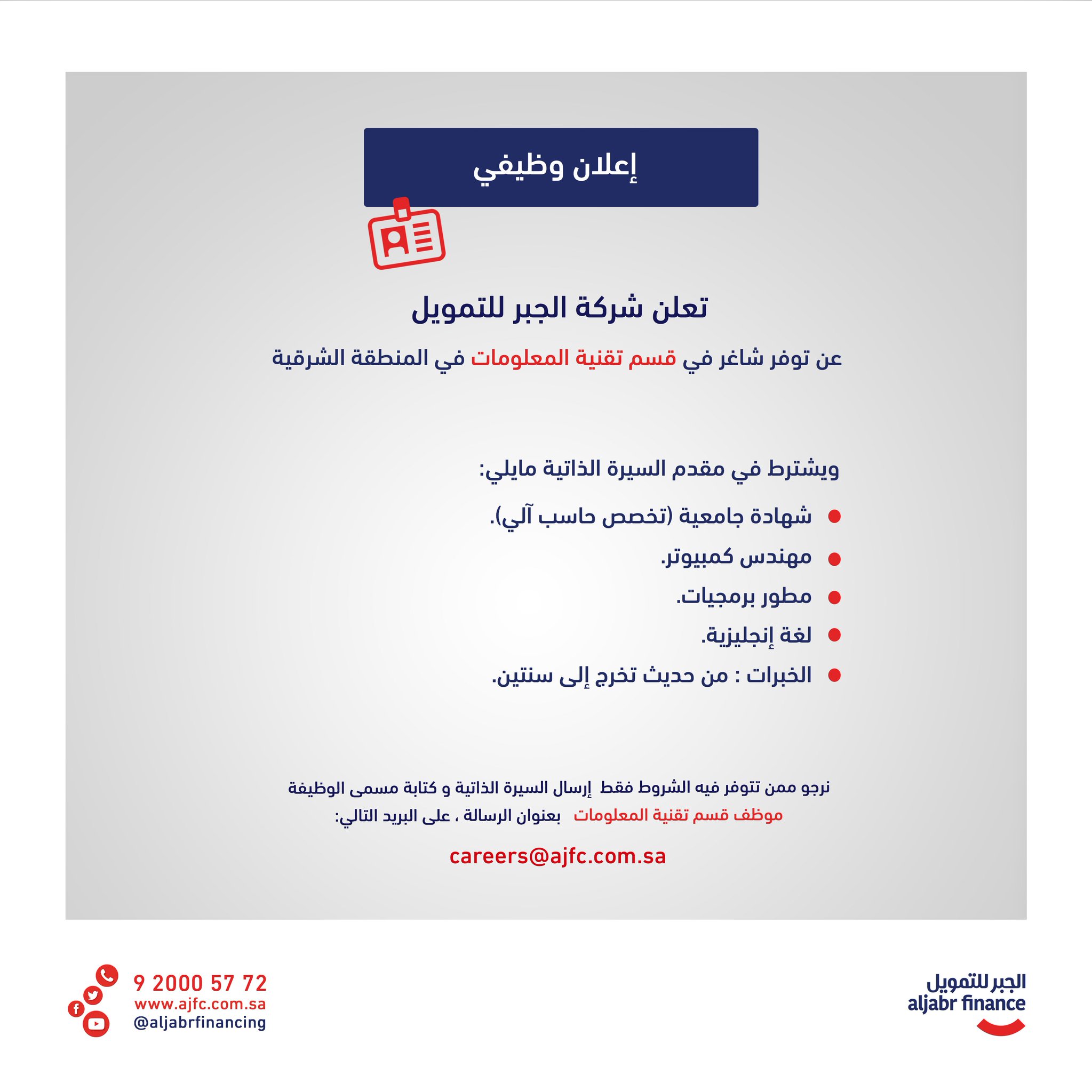 الجبر للتمويل On Twitter تعلن شركة الجبر للتمويل عن توفر شاغر وظيفي في مدينة الدمام الجبر للتمويل وظائف